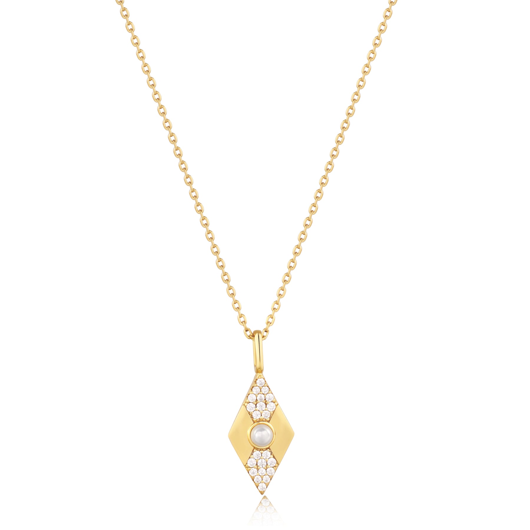 Embrace contemporary luxury with a nod to modernist art references with this striking gold pendant necklace. Crafted in 14kt gold-plated sterling silver, the delicate link chain features a unique pendant finished with a classic pearl and shimmering cubic zirconia set on a geometric shape. Style yours with short gold chain necklaces or team with a pair of statement pearl earrings.