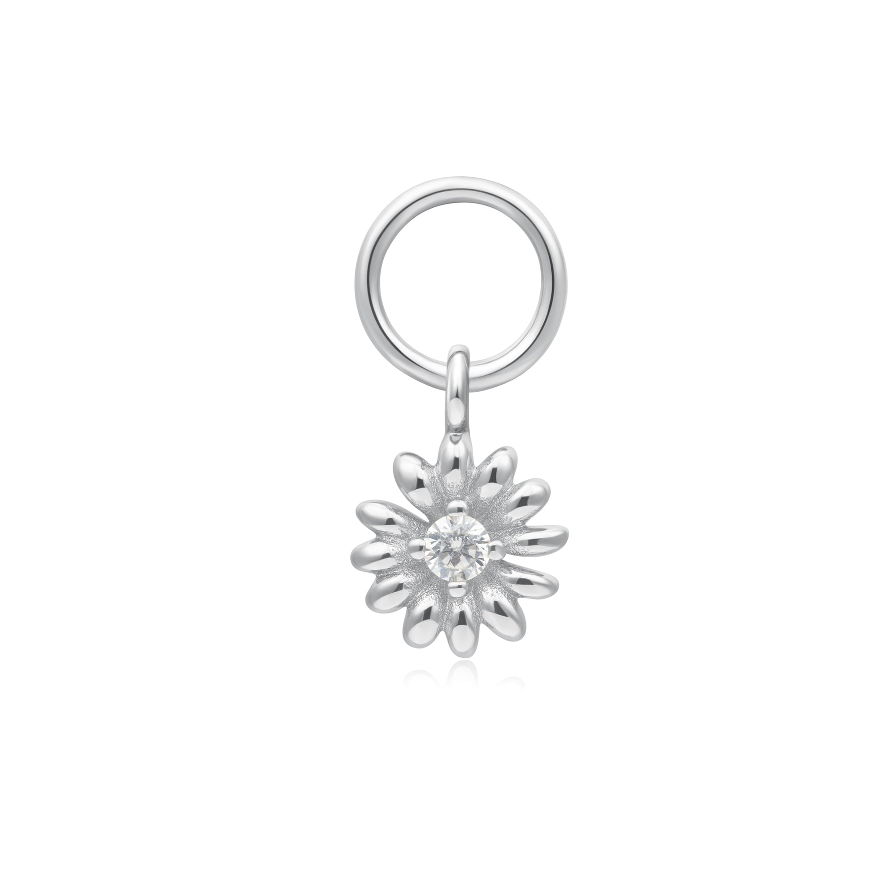 Embrace the new season in style with a touch of floral freshness with our rhoidum-plated sterling silver daisy earring charm. Finished with a sparkling centre cubic zirconia stone, this delicate, intricately-crafted flower is the perfect finishing touch to any summer-ready earring stack. Slip on a hoop or huggie earring and you're ready for the sun.