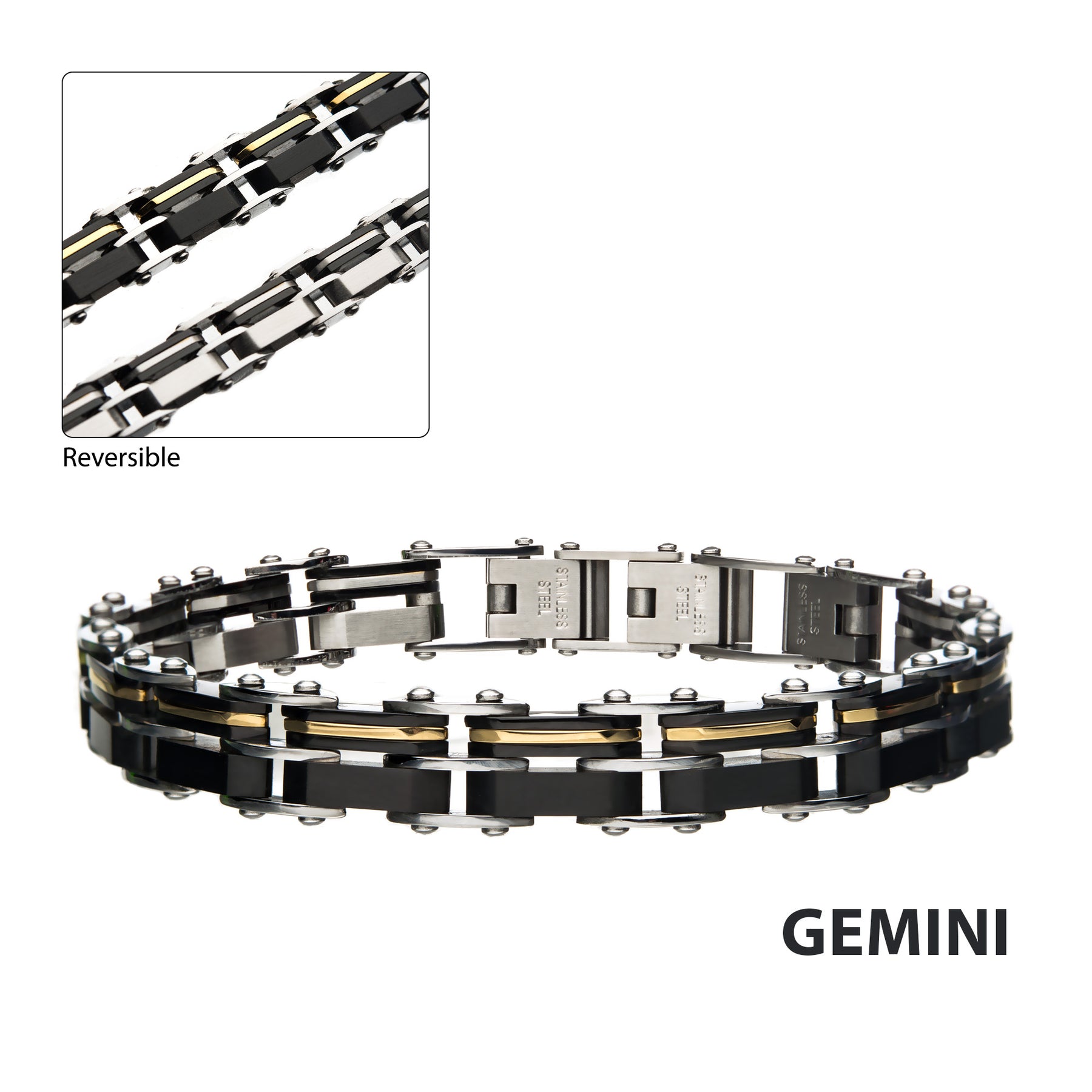 Men's Stainless Steel Gold IP & Black IP Reversible Bracelet with Fold Over Clasp, 7.75"" + 1 Self - Adjustable Link.