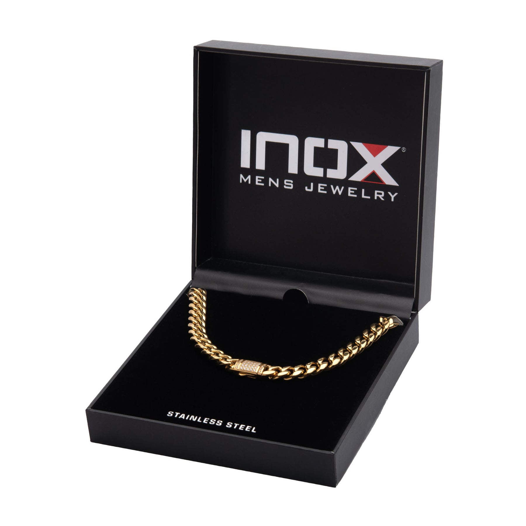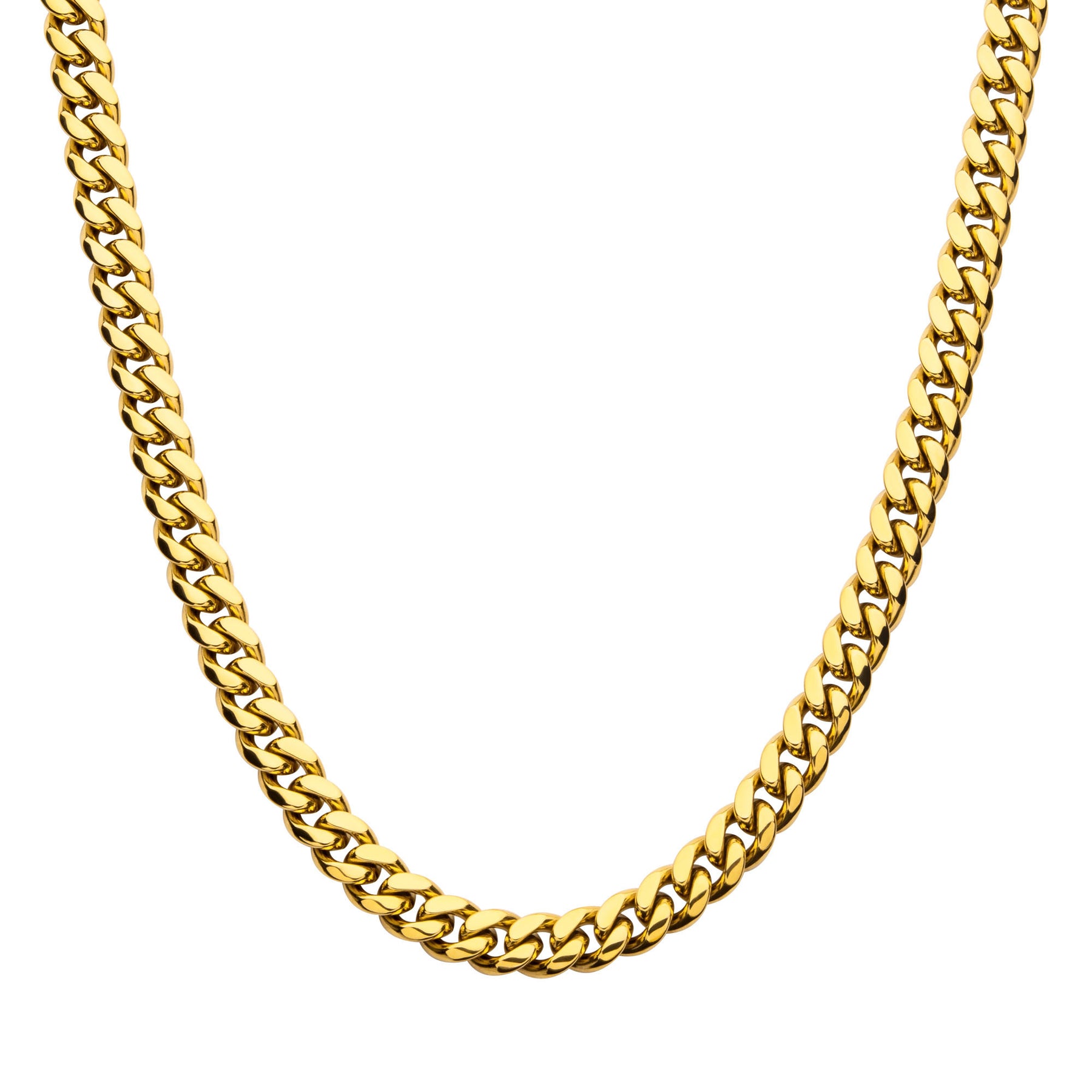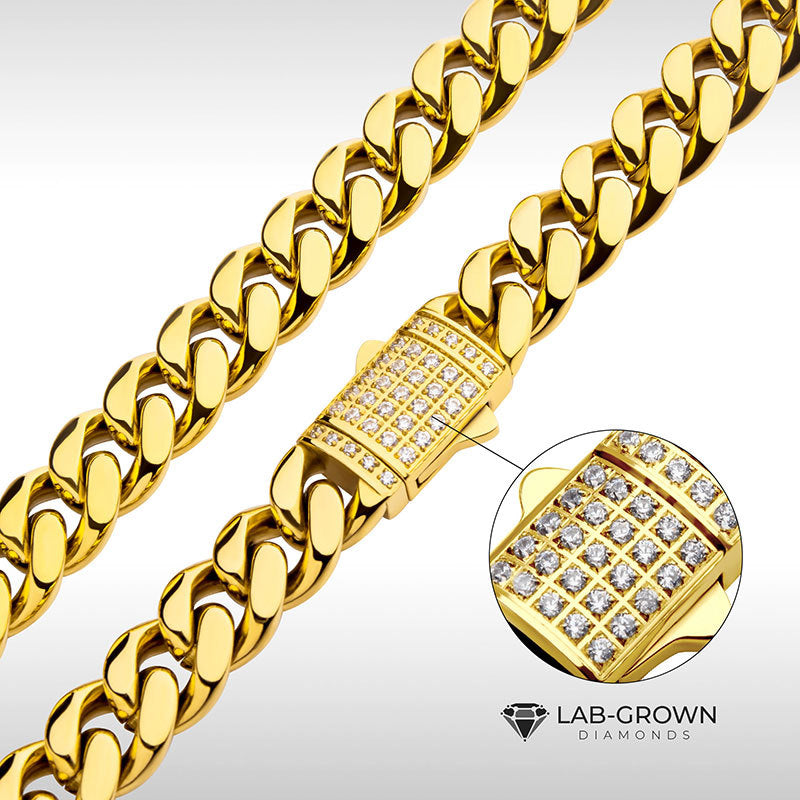 Men's Stainless Steel 18Kt Gold IP 10mm Miami Cuban Chain Necklace with 25pcs 1.5mm + 10pcs 1.2mm Clear Lab-grown Diamonds Double Tab Box Clasp. Available lengths: 22"" and 24"". All Lab-Grown Diamond Collection items come with a premium gift box.