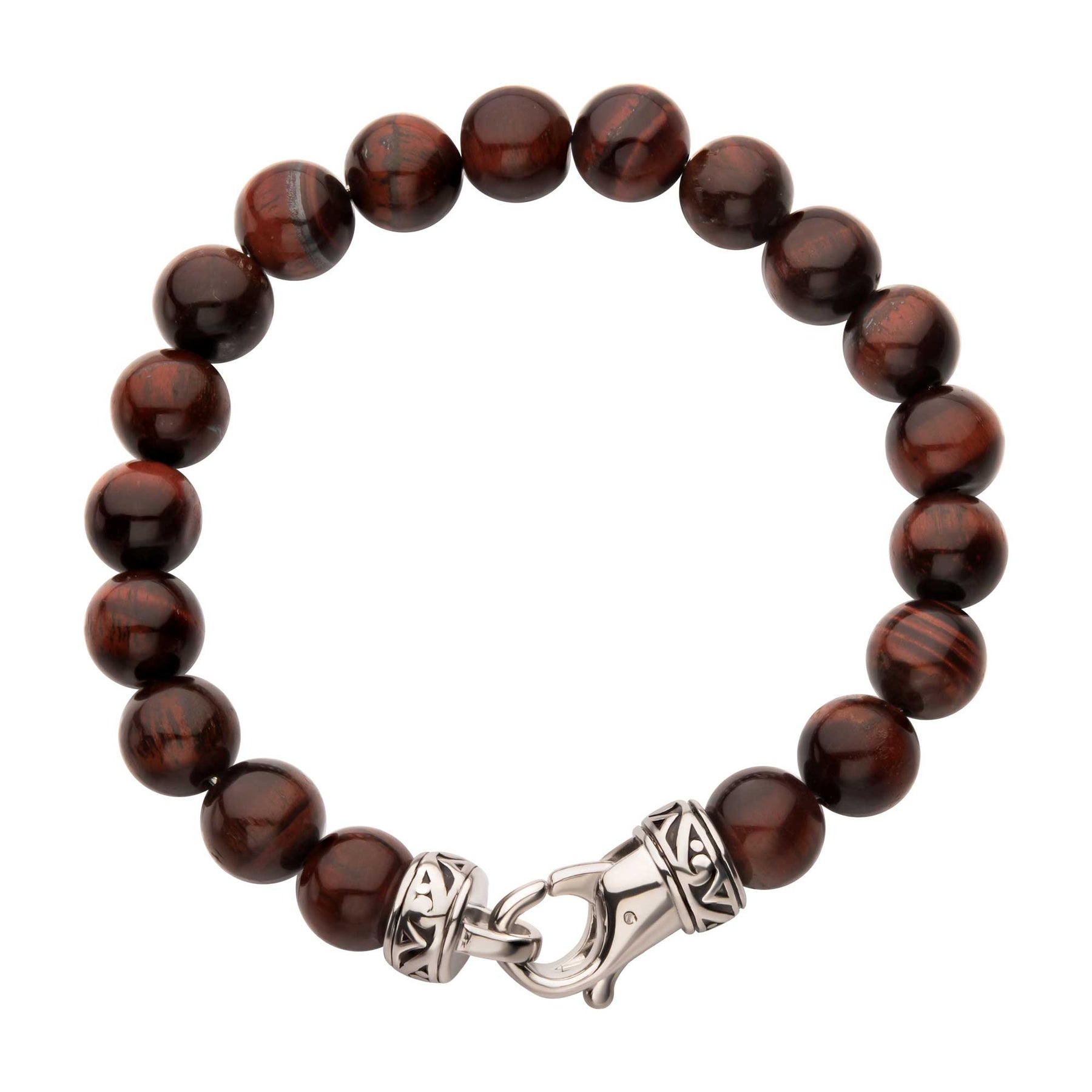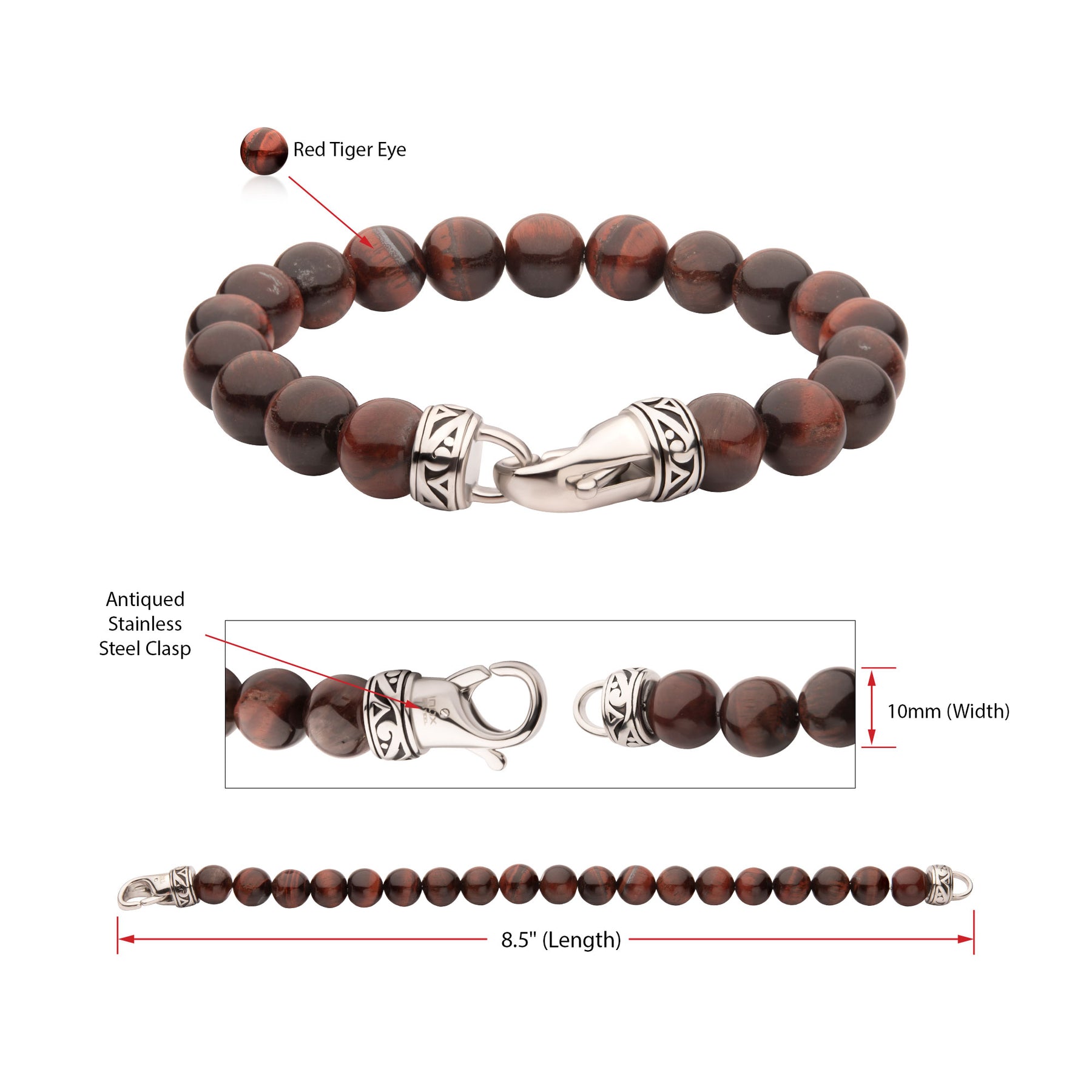 Men's 10mm Red Tiger Eye Stone Bead Bracelet with Antiqued Stainless Steel Clasp.