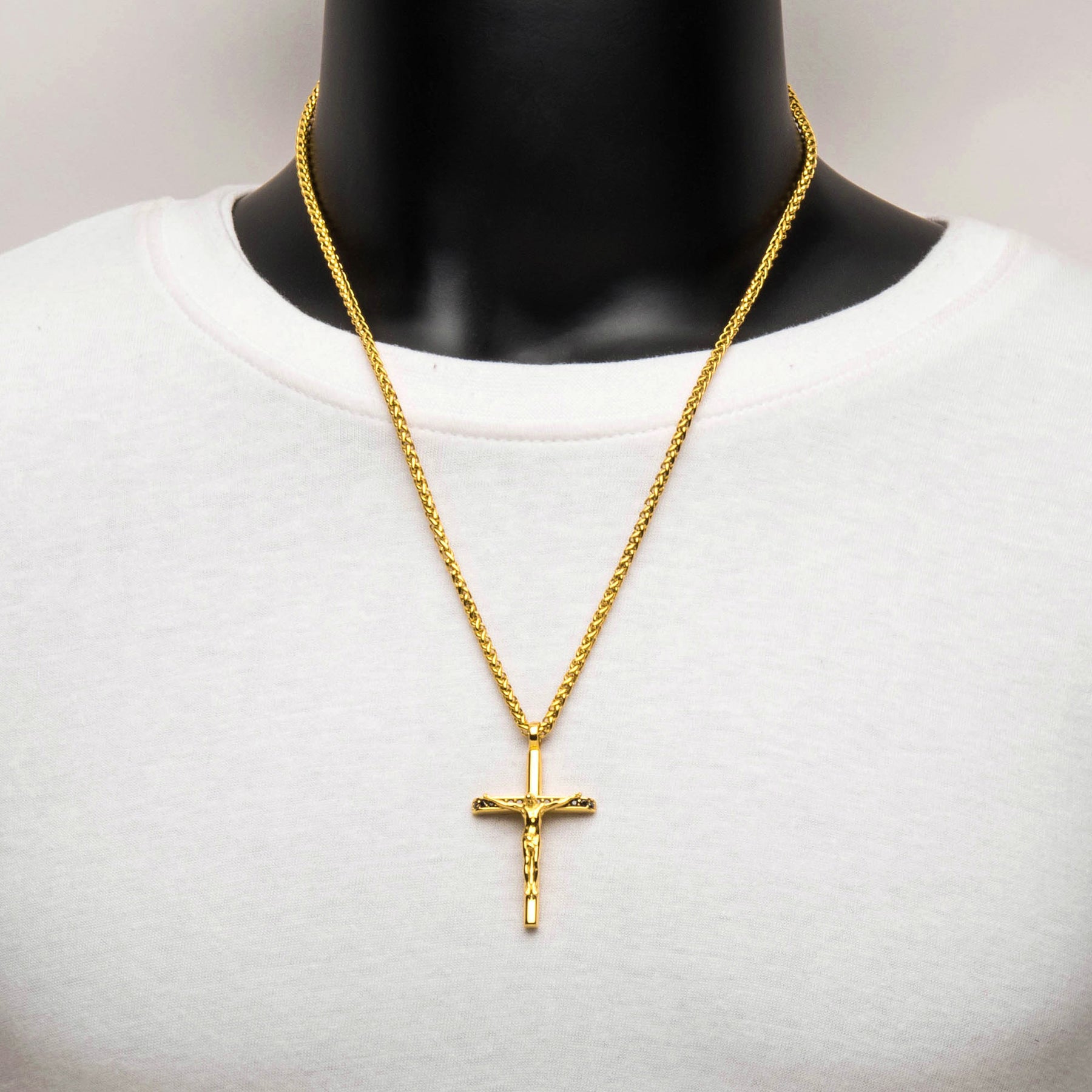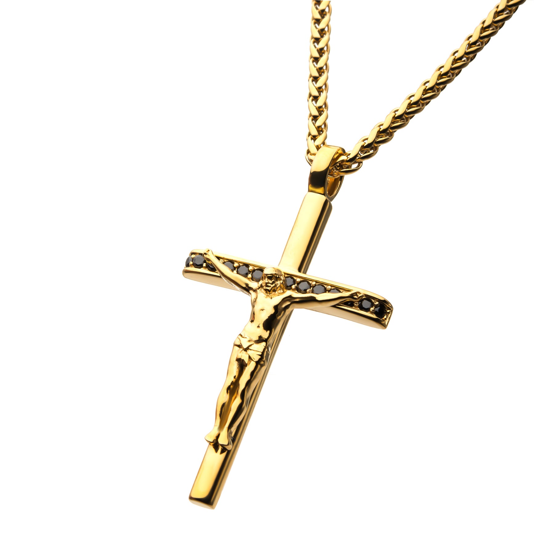 Men's 18Kt Gold IP Steel CNC Set Genuine Black Sapphire Gem Jesus Christ Crucifix Cross Pendant with Wheat Chain. Pendant size: 46mm (L) x 30.3mm (W) x 8.4mm (THK).