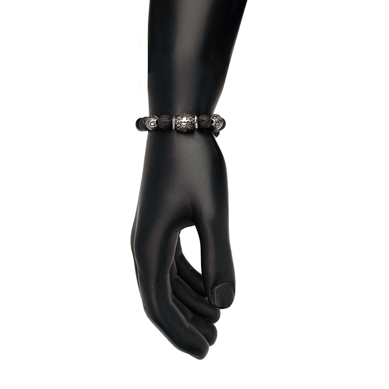Men's Black Onyx & Lava Stone with Fleur-de-lis Cast Steel Bead Bracelet.