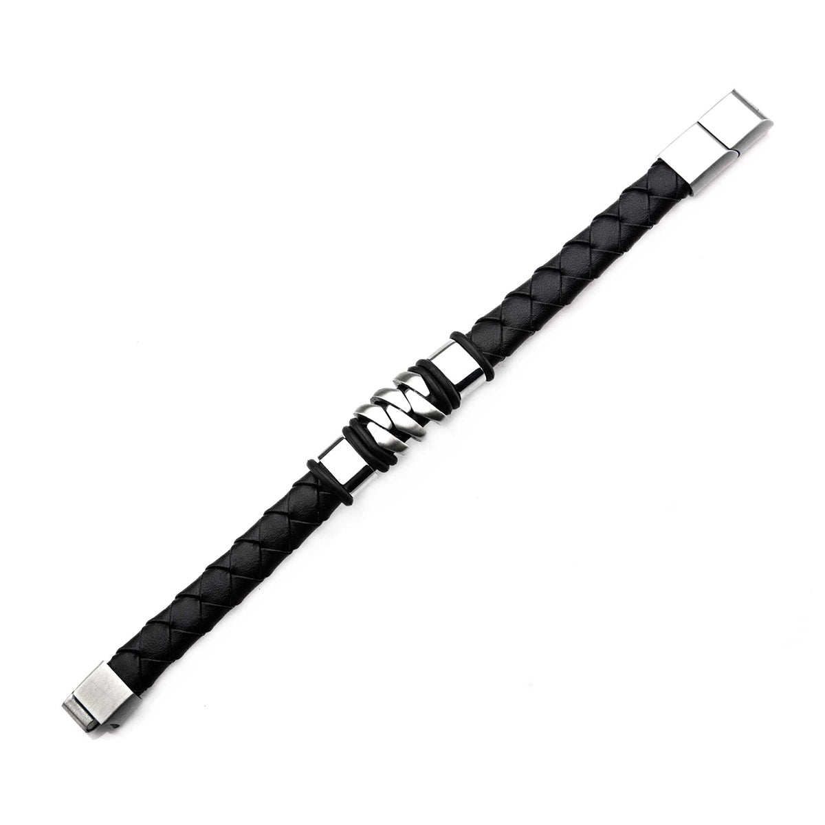 Men's Stainless Steel with Matte Black Leather Bohemian Bracelet with Slide Magnetic Clasp, 7.75"" + 1 Self - Adjustable Link.