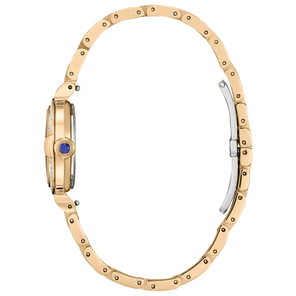 Classic lines and hints of romance make this newest timepiece to our women?s collection, the Citizen L Mae, a glamorous addition of sustainable luxury. With?a 26mm case design inspired by a vintage perfume bottle and featuring the curved, sleek lines of May bells, the diamond-set bezel shape has a distinct feature at the 3 o?clock position, where the crown resembles an elegant perfume stopper.