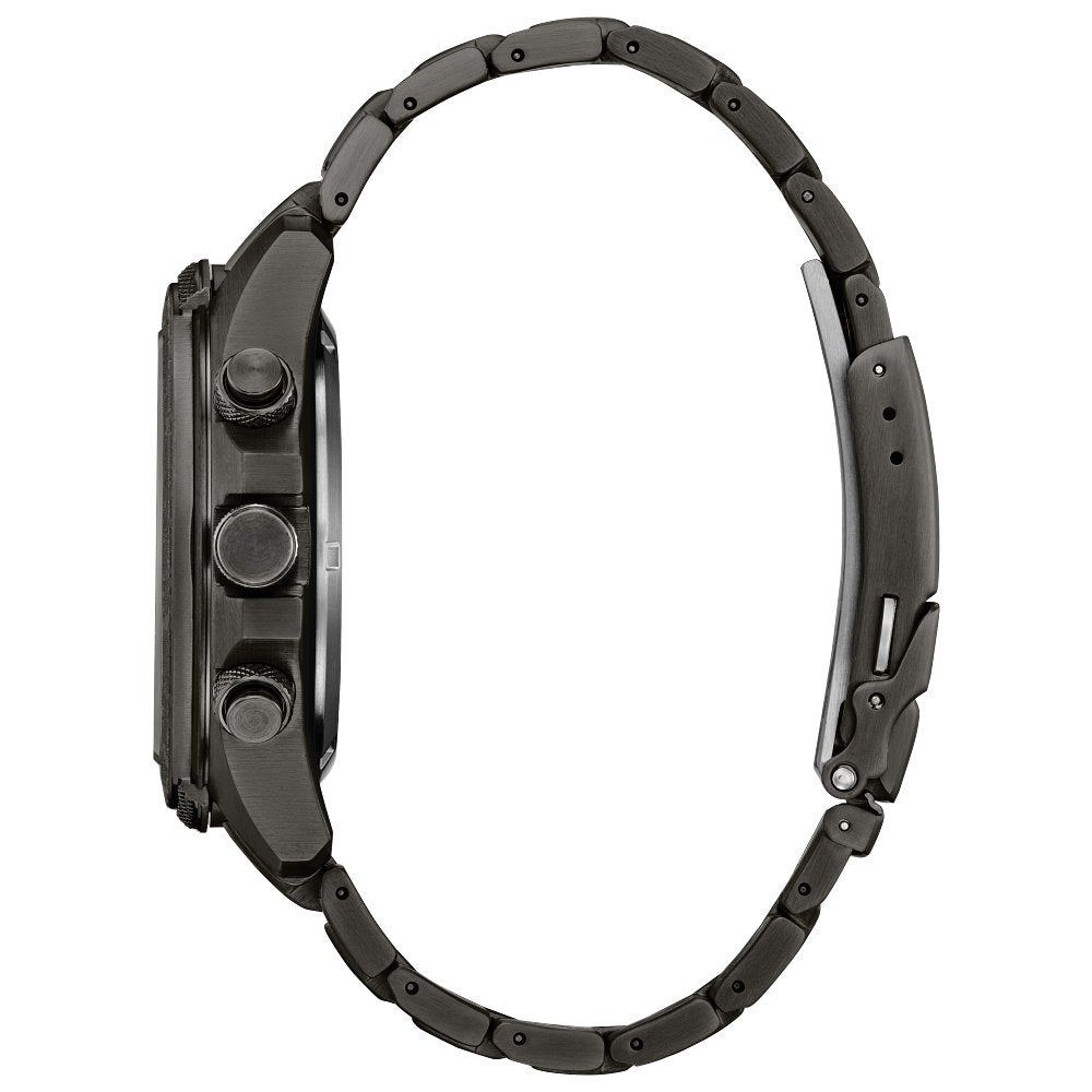 From its bold case inward, the watch is ready for action, featuring a 43.9mm stainless steel case with a gray IP coating and camo accents for durability that goes the distance. On the dial, luminous hands and markers stand out on a camo black background for high legibility, while a combination of digital and analog details ensures mission-ready wear. Two right-side pushers and an 8 o'clock crown to move the watch's compass scale help the user operate Promaster?s high-performance function on the display, which includes a world time, chronograph, alarm, light level indicator, perpetual calendar, power save mode, charge level display, and summertime display. The limited edition Promaster is sustainably powered by any light with our proprietary Eco-Drive technology, so it never needs a battery. This high-performance watch comes in an exclusive gray tackle box with camo detailing and is water resistant to 200 meters. Caliber U822.