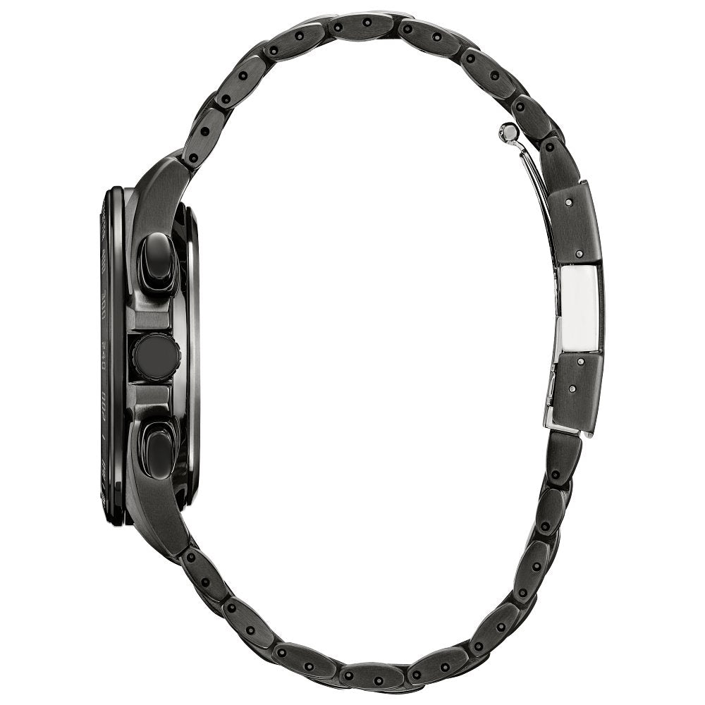 Joining Citizen's cutting-edge catalog of timekeepers, the sharp chronograph features a scratch-resistant Super Titanium? case with a black DLC coating, measuring 43mm in diameter. Secured to the wrist via a finely-finished 5-link bracelet to solidify the lightweight, durable construction of the timepiece, outer tachymeter and inner world time equipped bezels hint at the elevated technological capabilities of the watch, while a duo of stepped chronograph pushers and crown guards provide a sleek and sporty touch. On the Earth-inspired dial, a three-register chronograph is at work, with touches of greens, purples, and blues adding crystalline-like dimensionality alongside the utility of a day and date display.