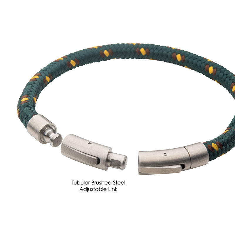 Men's Stainless Steel 6mm Green, Brown and Yellow Nylon Cord with Brushed Tubular Press Clasp Bracelet. Comes with 1 Self-Adjustable Link. Length: 8.5"" - 8"".