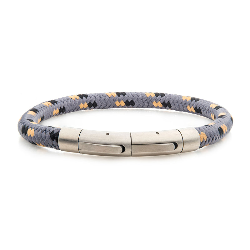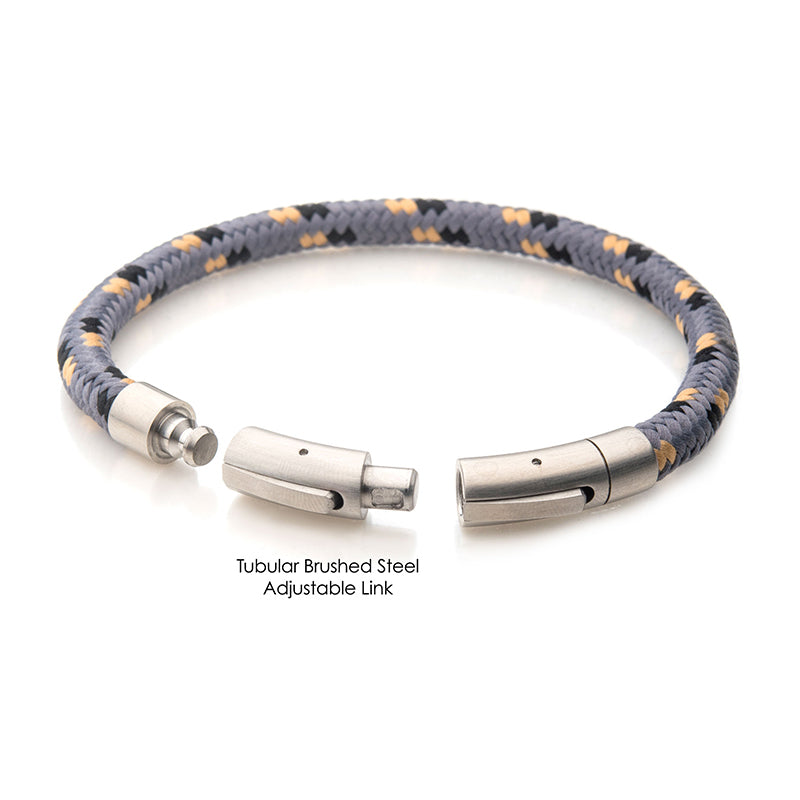 Men's Stainless Steel 6mm Grey, Black and Beige Nylon Cord with Brushed Tubular Press Clasp Bracelet. Comes with 1 Self-Adjustable Link. Length: 8.5"" - 8"".