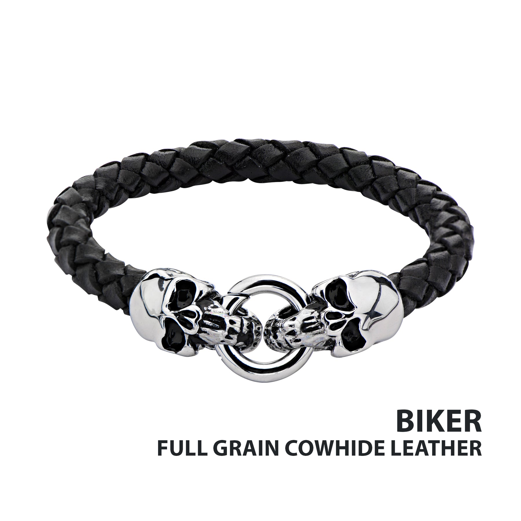 Men's Black Leather Bracelet with Two Steel Skulls and Tension ring Clasp, 0.375 inch (H).