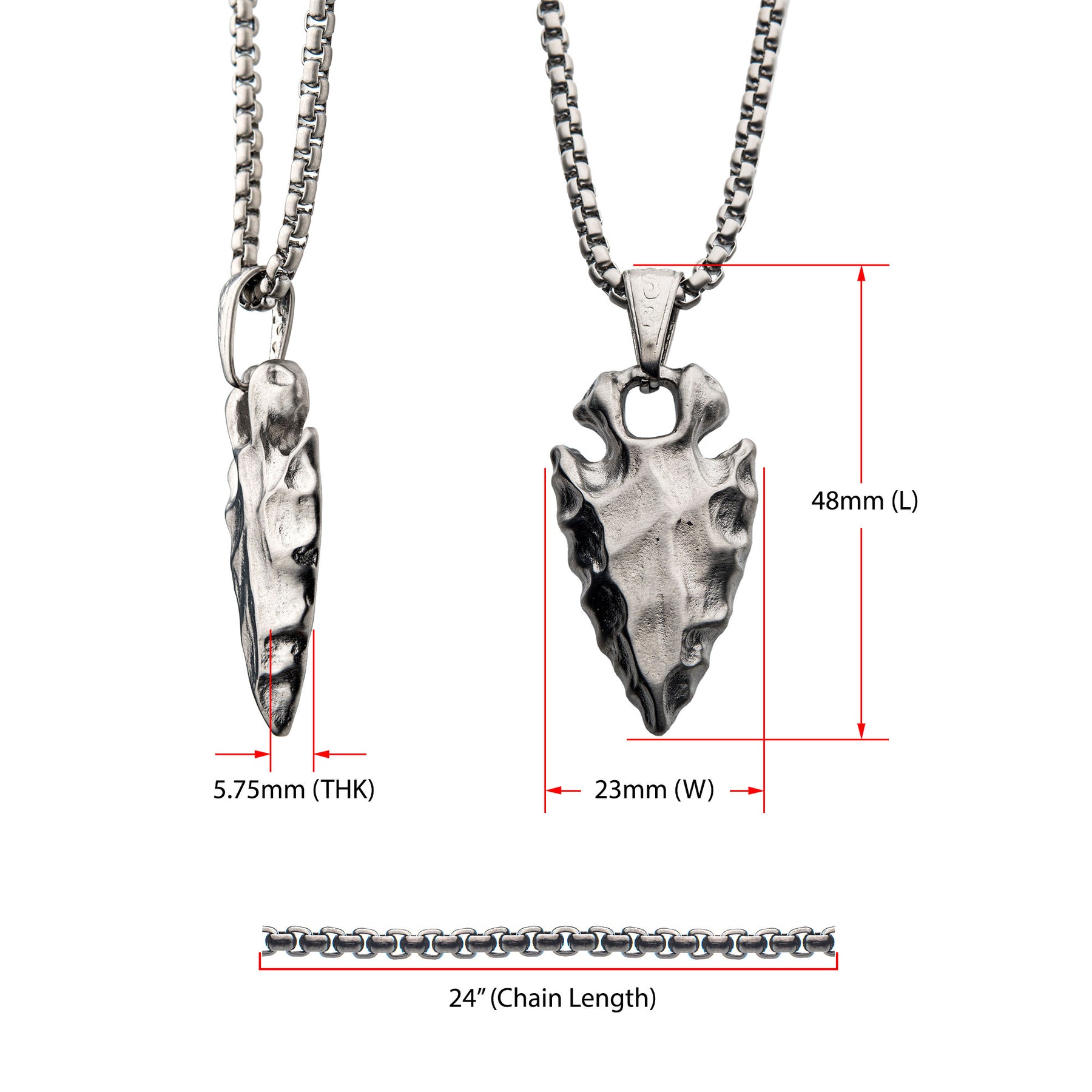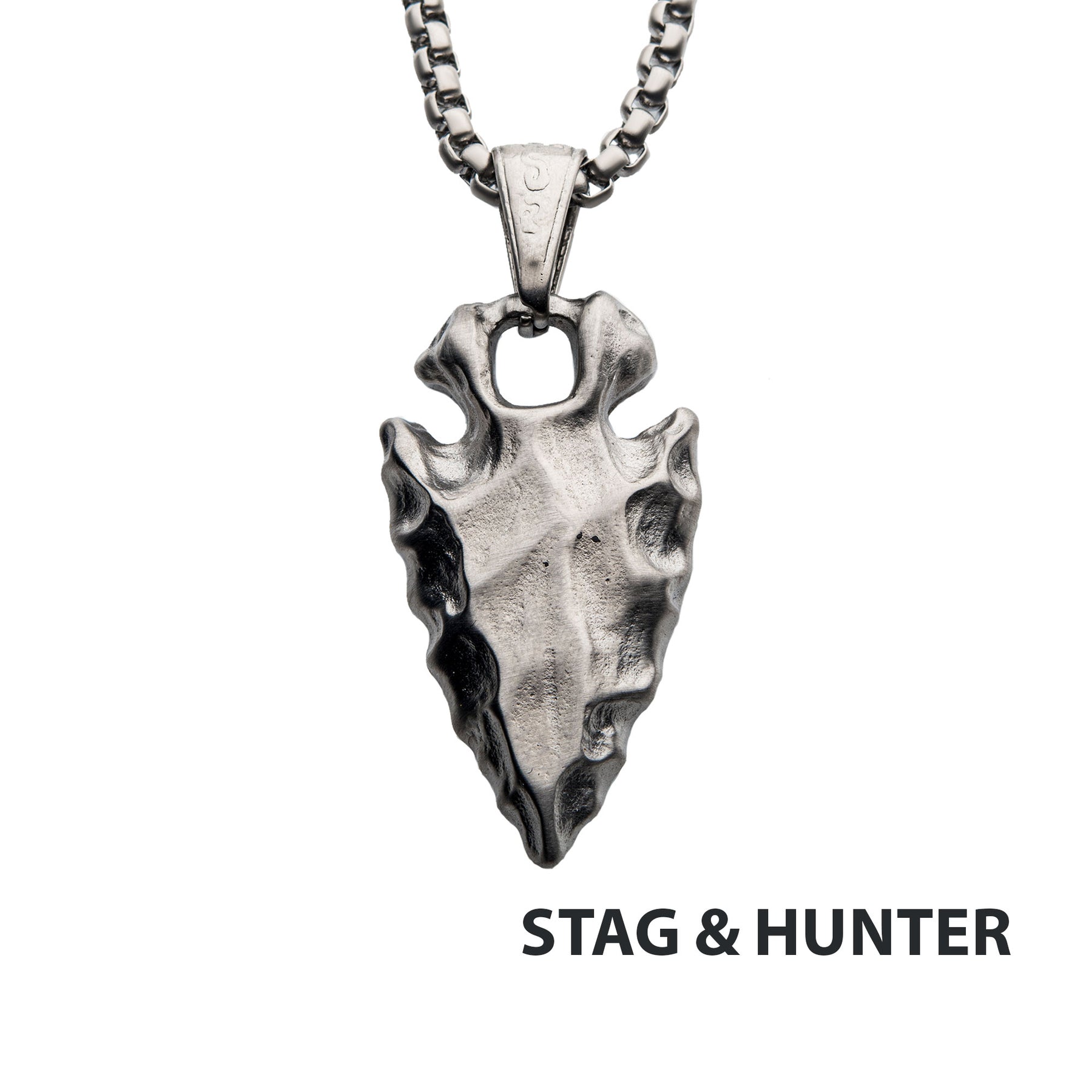 Arrowhead Collection- Reminiscent of the Native American past, mixed in with the grit of frontiersmen, the arrowhead pendant is a symbol of the warrior inside all of us. New styles feature ""chiseled"" arrow tips in steel, and Genuine Semi-Precious Stone inlay with wildlife markings design on the reverse revealing more of the pattern unique to each natural stone.