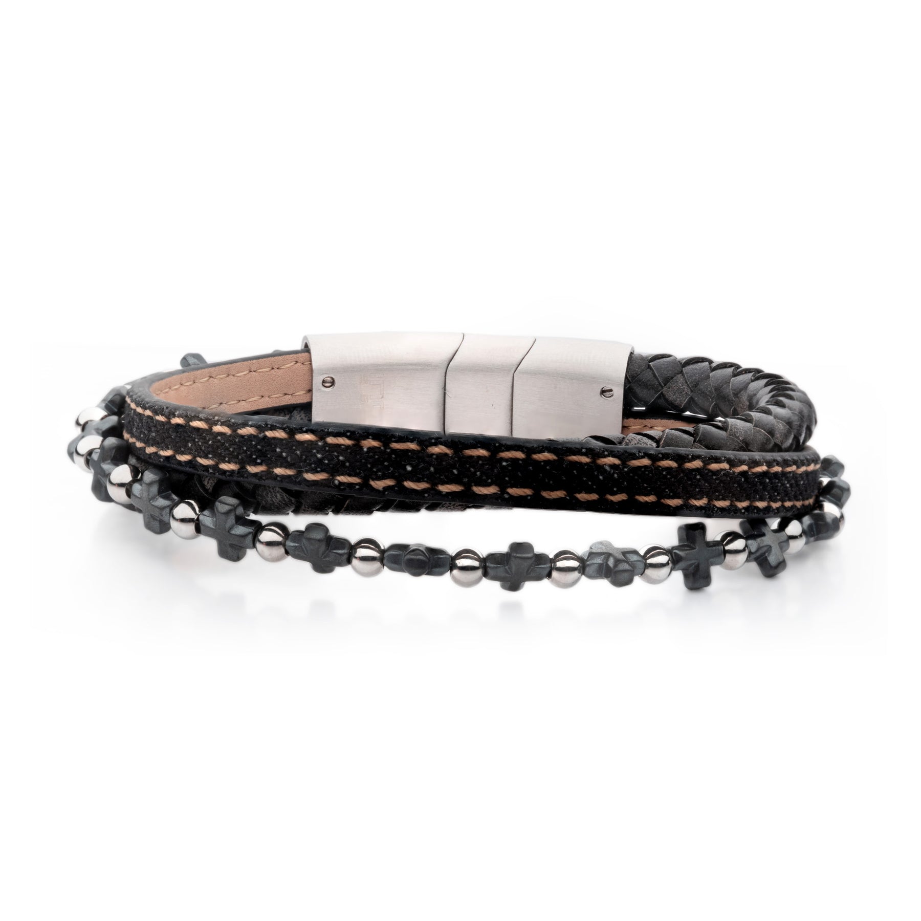Denim, Black & Brown Full Grain Cowhide Leather with Hematite Cross Bead Multi-Strand Bracelet