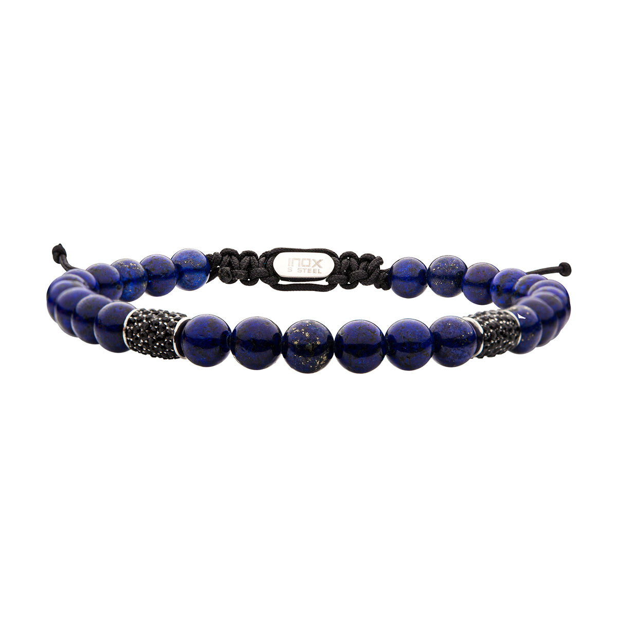 Stainless Steel Beads with Black CZ & Lapis Stone Bead Adjustable Non-Braided Bracelet