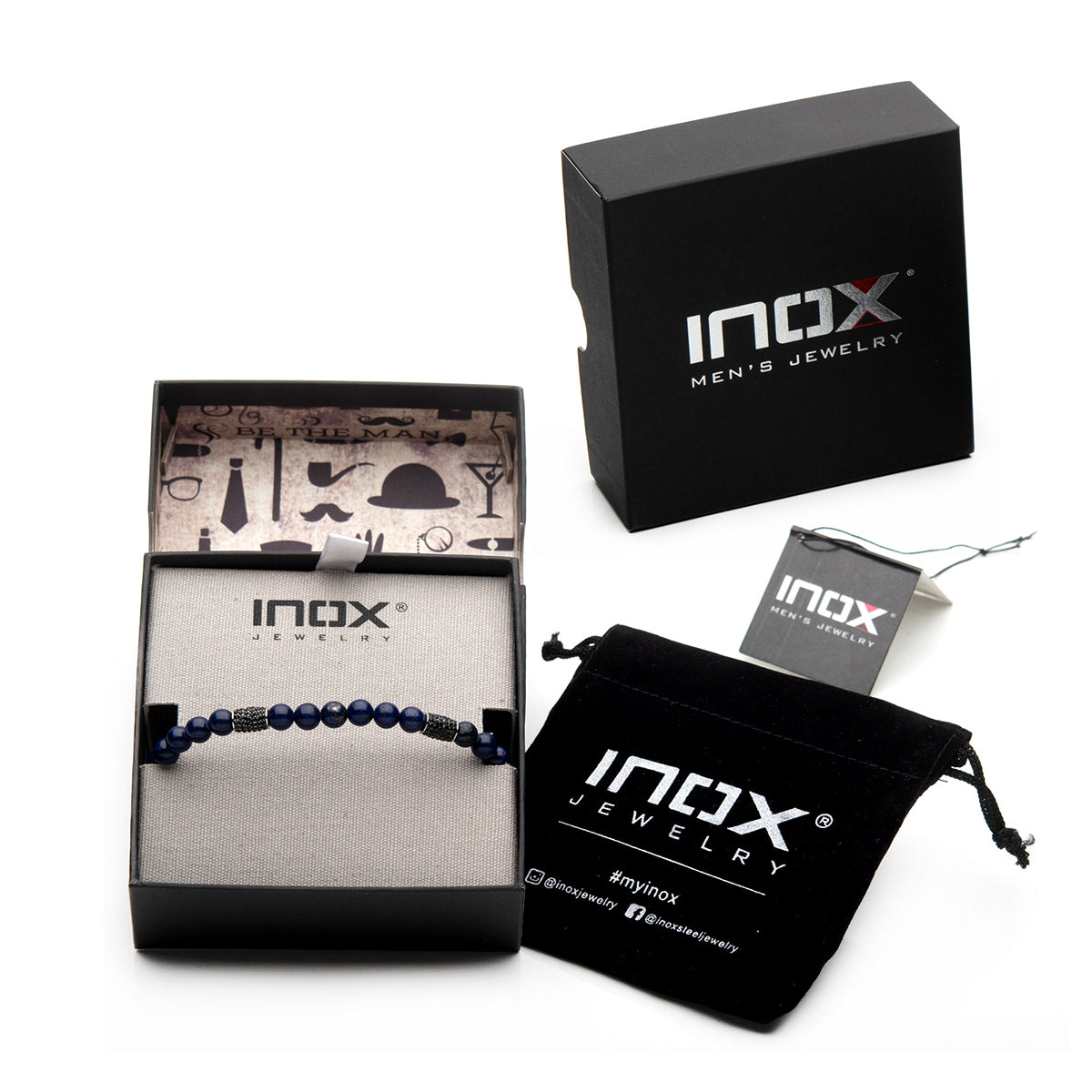 Honor Stone Lapis Lazuli 26 Polished Stone 6.8mm Beads and 2 Blackout Gem Steel Spacer Acccents (Prong-set Cubic Zirconia) Bracelet with Macrame adjustable 8"" long.