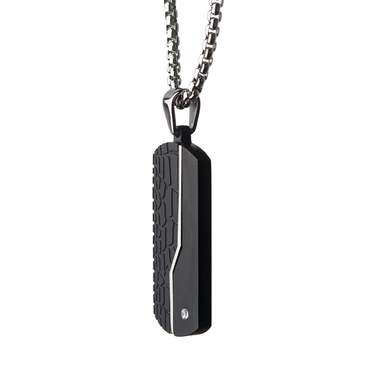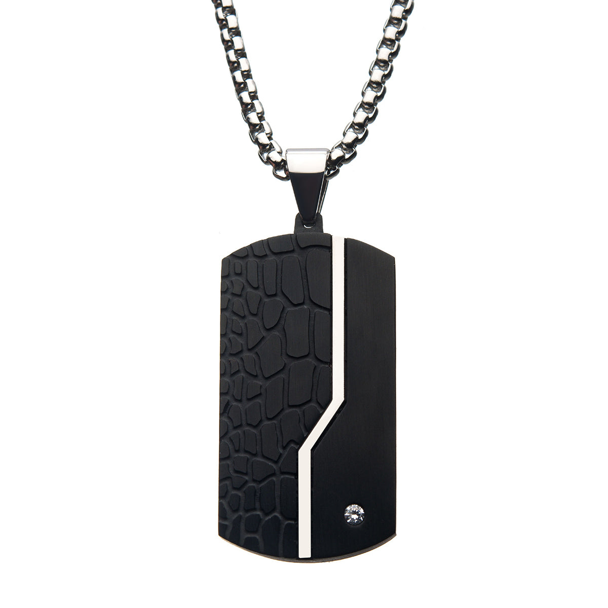 Men's Stainless Steel Crocodile Pattern in 2mm Clear Cubic Zirconia with 24 inch long Bold Box Chain Dog Tag Pendant. Pendant: 21mm (W) x 40mm (H) x 3.7mm (THK)