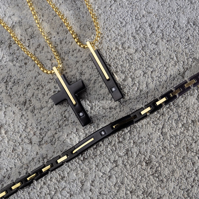 18Kt Gold IP and Black IP Steel Solitaire Accented Clear Lab-Grown Diamond Link Bracelet