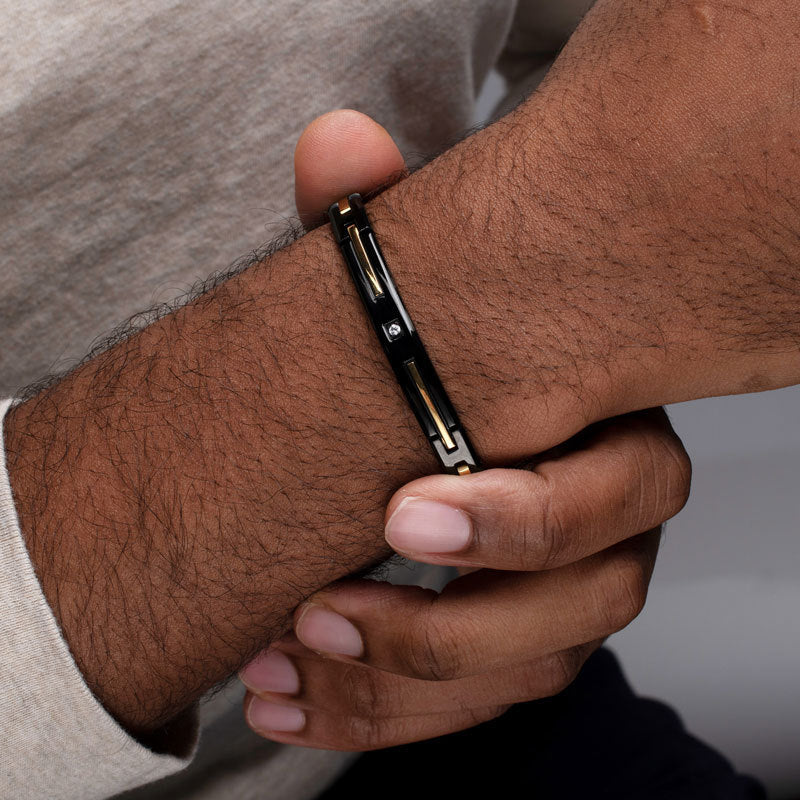 Men's 18Kt Gold IP and Black IP Steel Solitaire Accented Clear Lab-Grown Diamond Link Bracelet. Length: 7.5"" - 8.5"". All Lab-Grown Diamond Collection items come with a premium gift box.