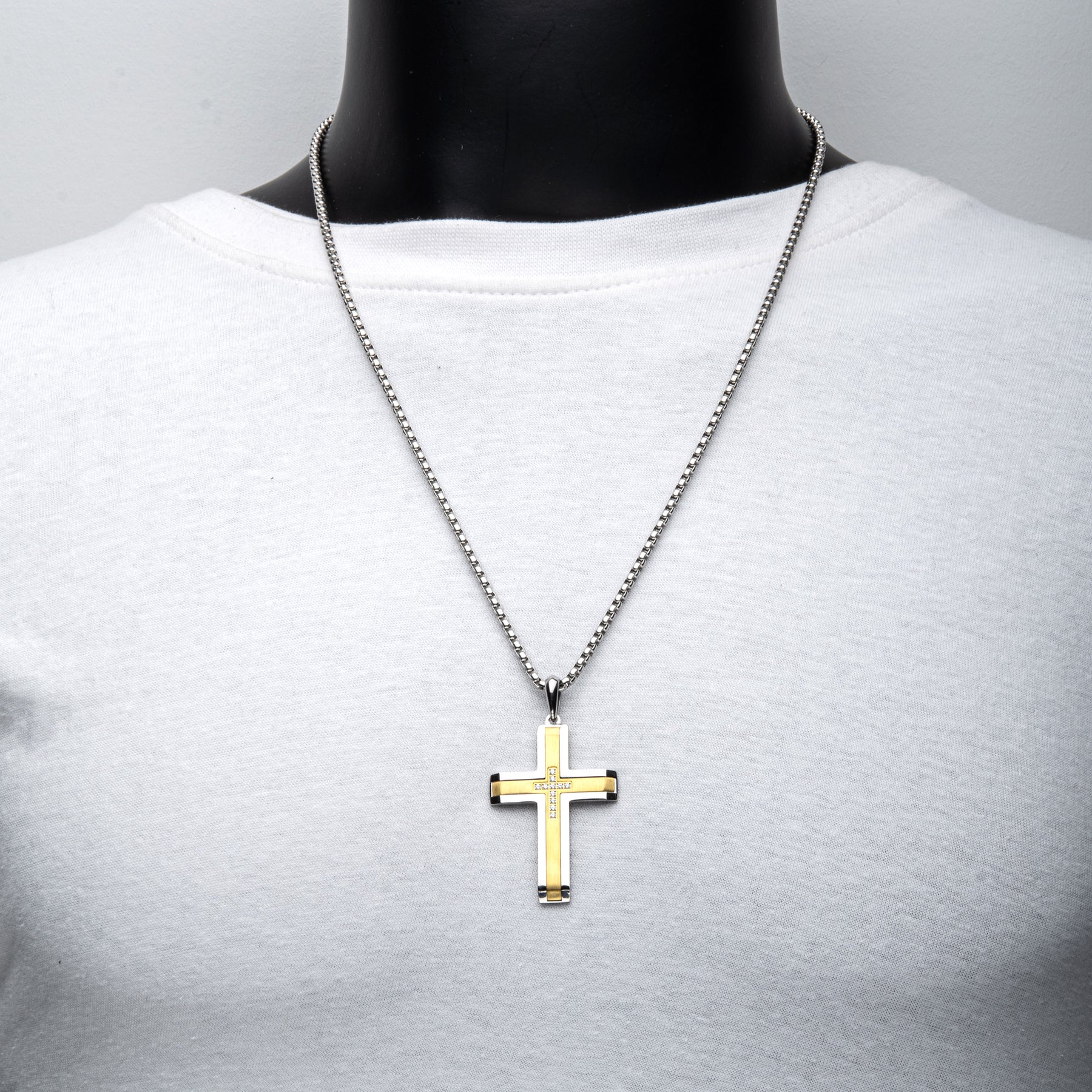 Men's 18Kt Gold IP Steel Lab-Grown Diamond Brushed Finish Cross Pendant with Box Chain.