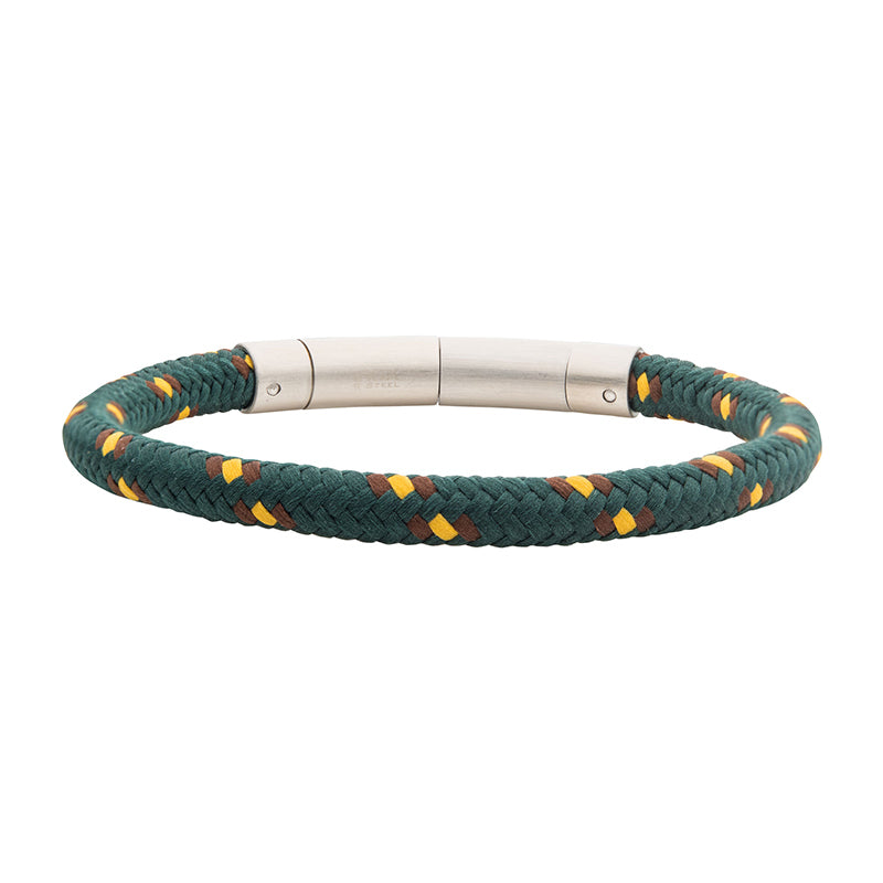 Men's Stainless Steel 6mm Green, Brown and Yellow Nylon Cord with Brushed Tubular Press Clasp Bracelet. Comes with 1 Self-Adjustable Link. Length: 8.5"" - 8"".