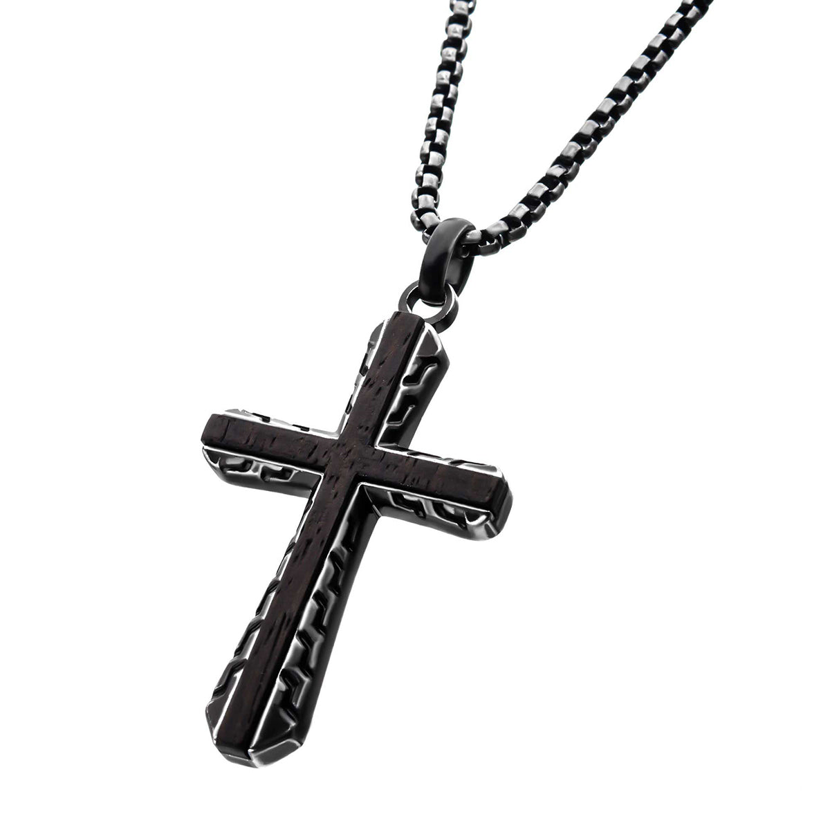These designs feature of genuine Ebony wood inlay, for a look reminiscent of the One true Cross, resting on top of a rugged steel design in dark finished steel tones. One of the crosses replaces Wood for Patterned carbon composite, for a look similar to the wood, but with a modern and more durable element incorporated.