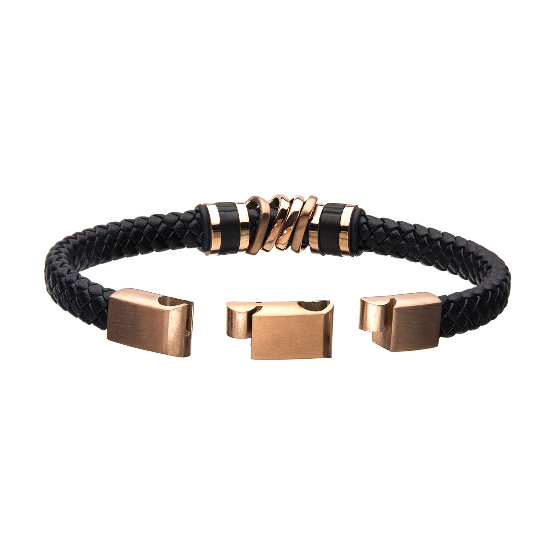 Black Braided Leather with Rose Gold IP Serrated Station Bracelet