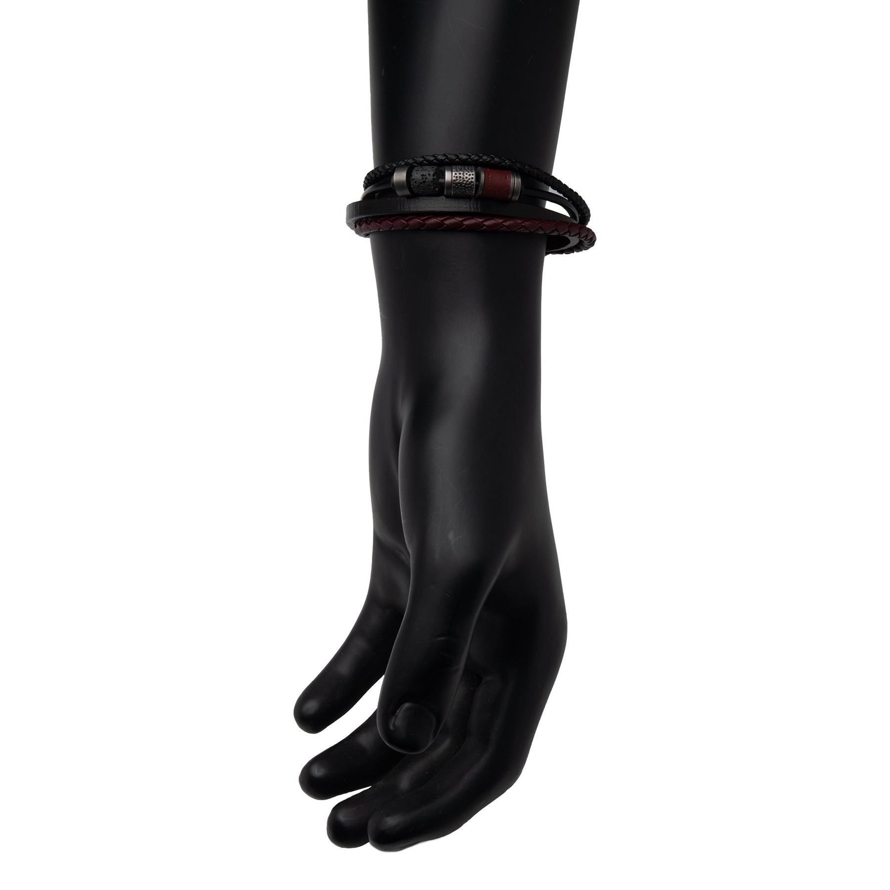 Black & Burgundy Leather with Lava Stone Bead Multi-Strand Bracelet