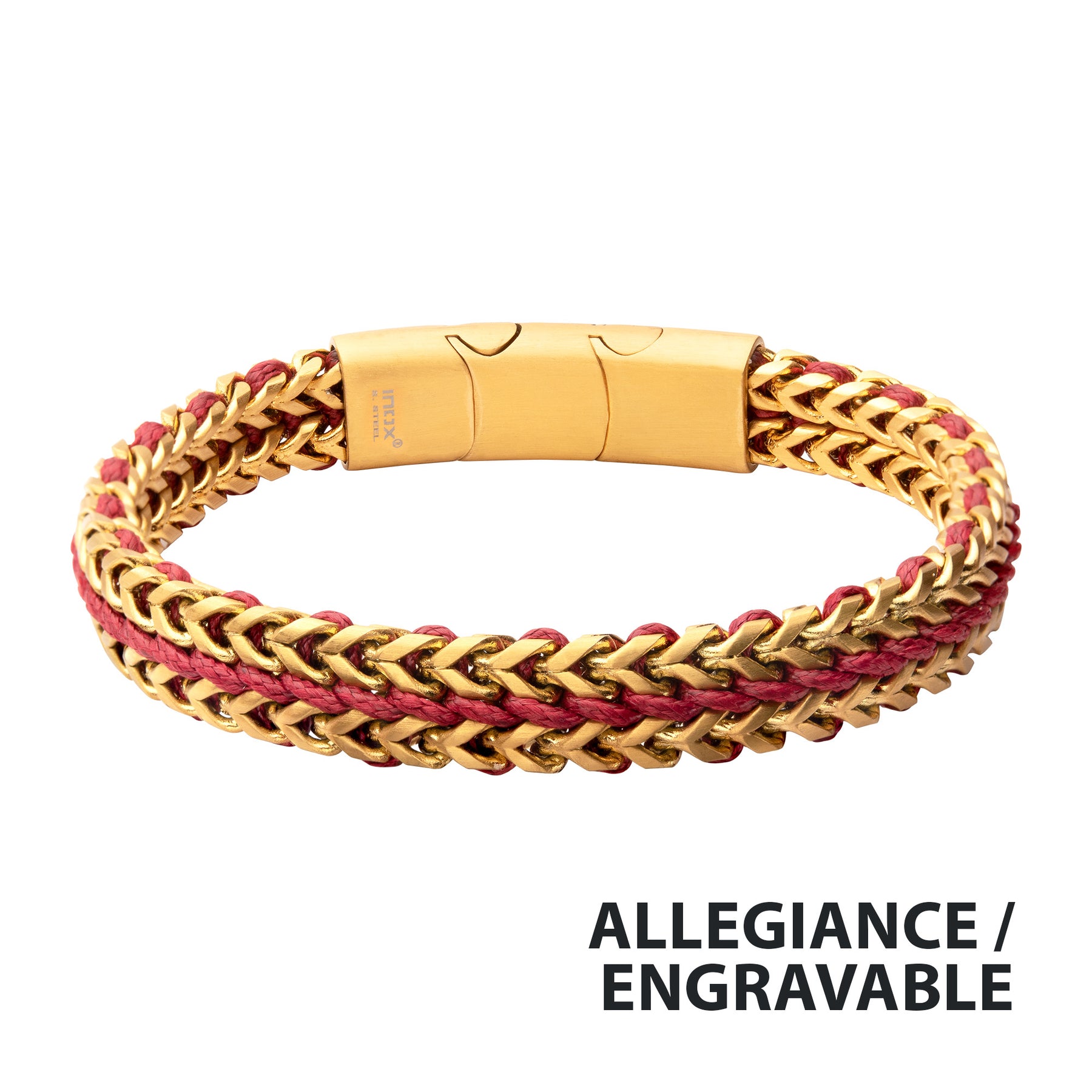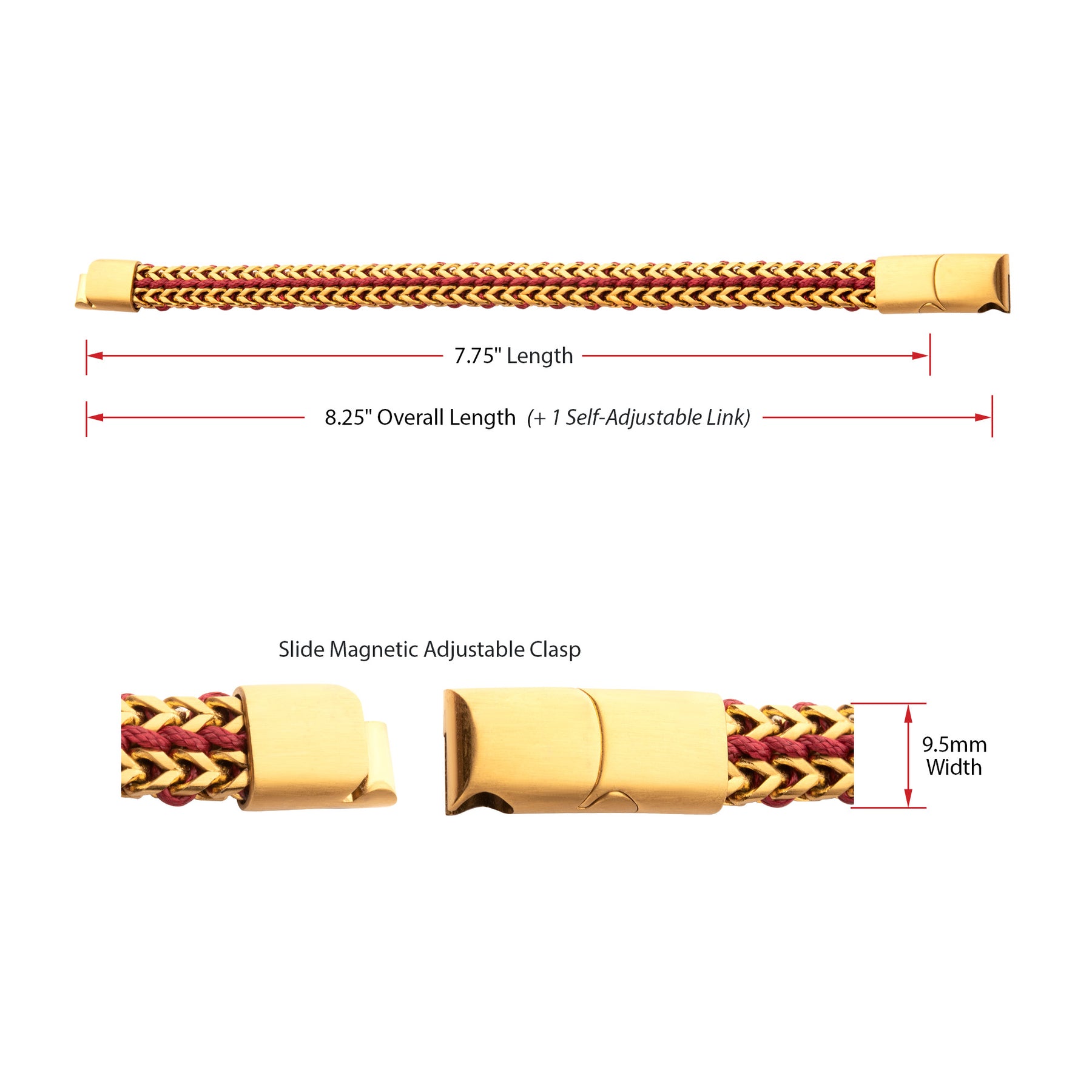 Men's Matte Finish Gold IP Stainless Steel Foxtail Chain with Red Wax Cord Bracelet with Slide Magnetic Clasp.