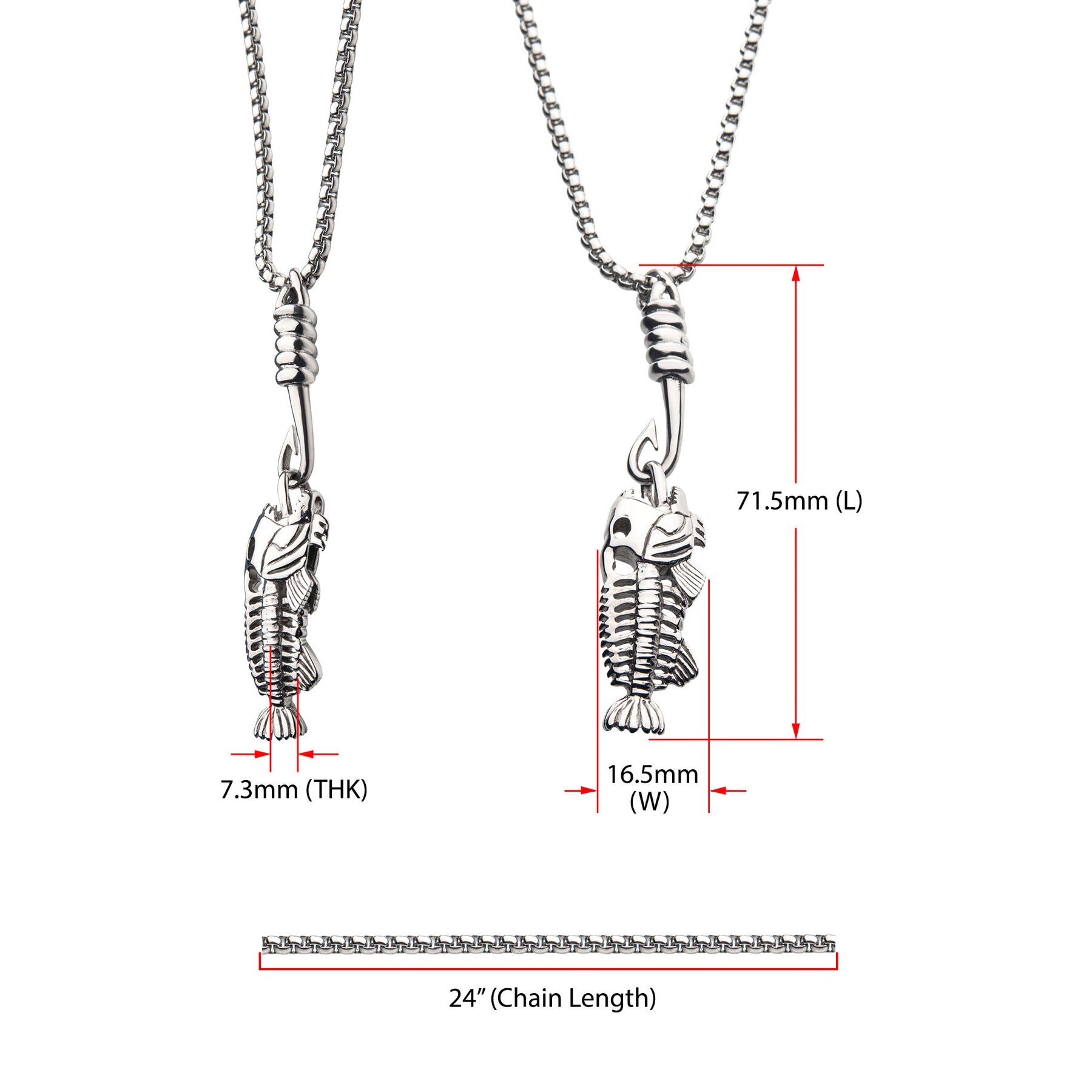 Men's Polished Steel Fishbone Pendant with 24 inch long Hook & Box Chain. Pendant: 16.5mm (W) x 71.5mm (H) x 7.3mm (D).