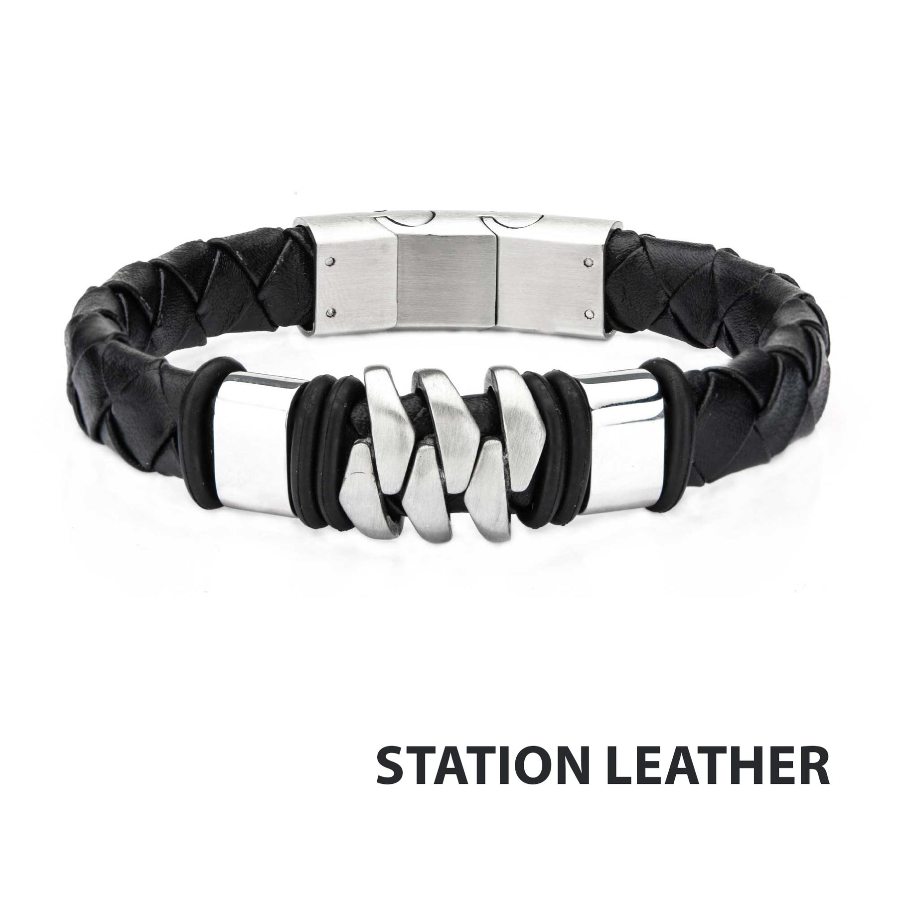 Men's Stainless Steel with Matte Black Leather Bohemian Bracelet with Slide Magnetic Clasp, 7.75"" + 1 Self - Adjustable Link.