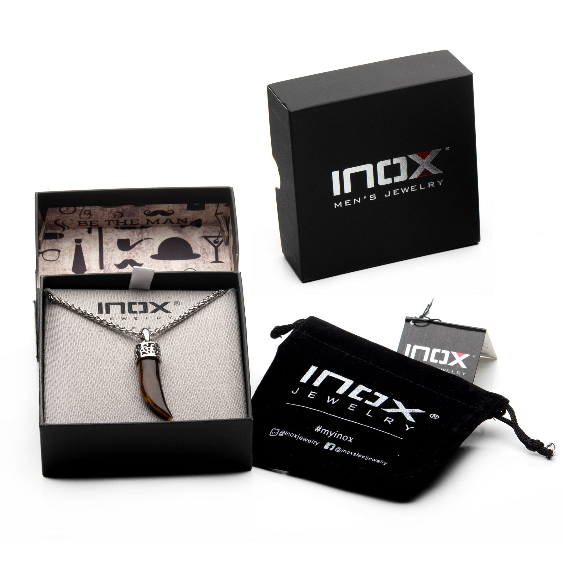Men's Stainless Steel with Tiger Eye Stone Horn Pendant, with 24 inch long Steel Wheat Chain. Stone: Pendant: 12.6mm (W) x 40.8mm (H) x 10.5mm (THK)