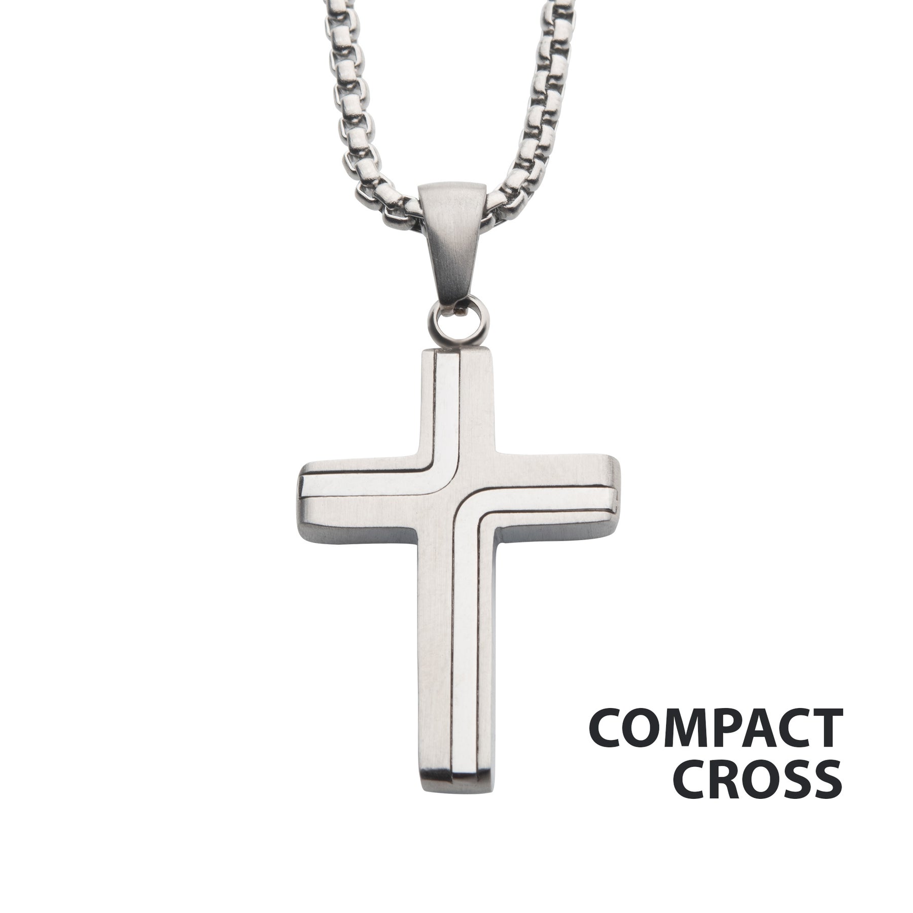 Men's Stainless Steel 33mm Cross Drop Pendant with 2mm Round Box Chain. 22 inch long. Pendant: 17.4mm (W) x 24.7mm (H) x 3mm (THK)