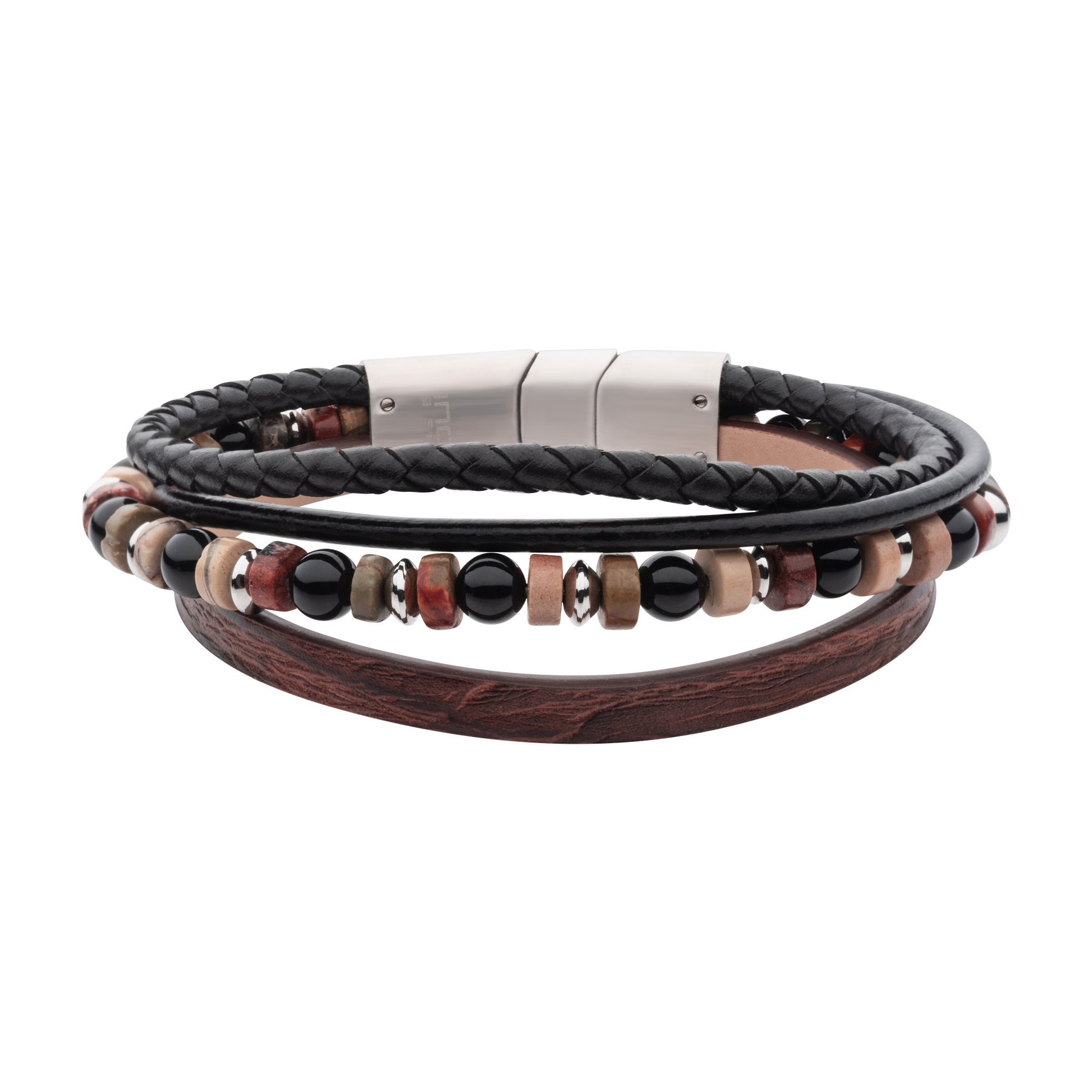 Men's Brown & Black Full Grain Cowhide Leather with Black Onyx & Bloodstone Bead Multi-Strand Bracelet with Matte Finish Steel Slide Magnetic Clasp, 8"" + 1 Self- Adjustable Link.