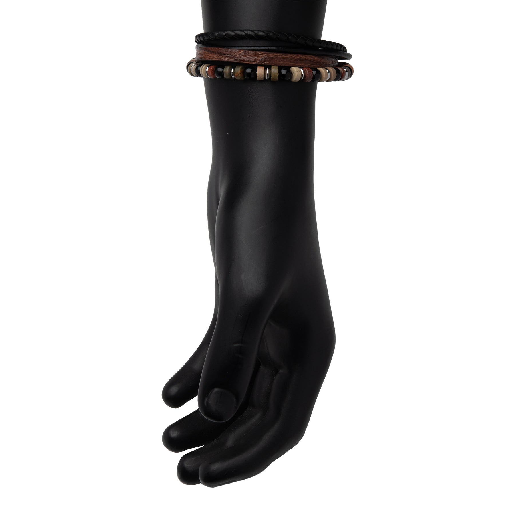 Brown & Black Full Grain Cowhide Leather with Black Onyx & Bloodstone Bead Multi-Strand Bracelet