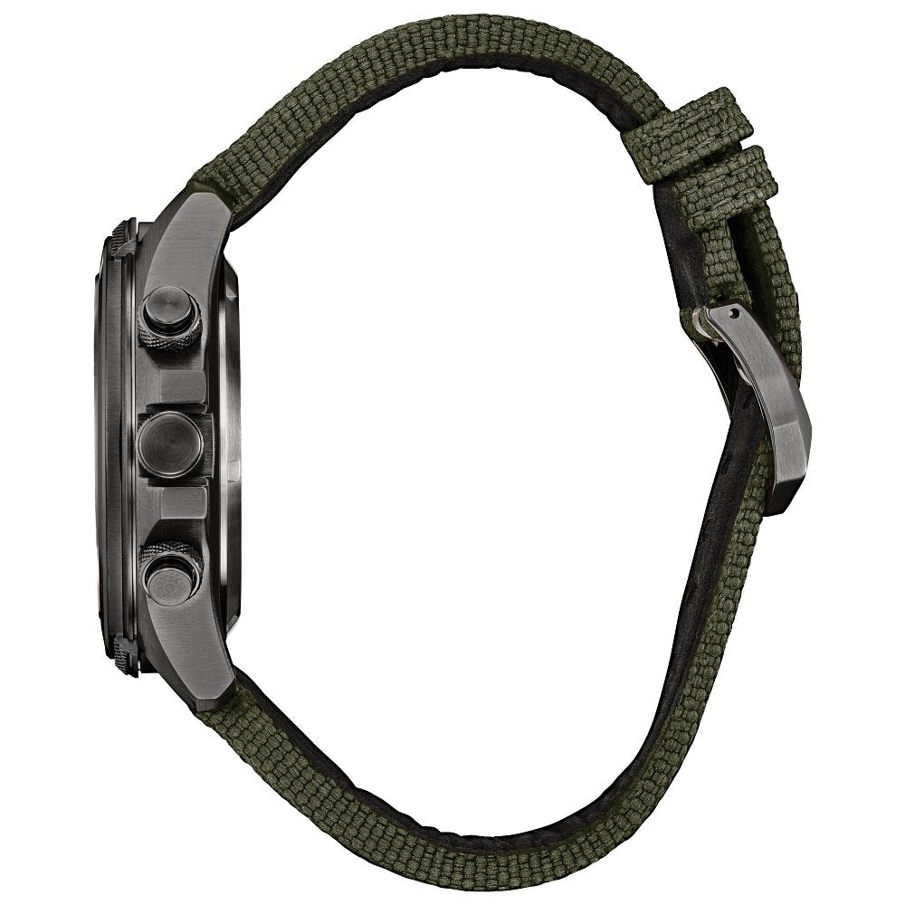 Be ready for the field with the latest adventure-ready timepiece from Citizen?s Promaster Land series. Dubbed the Promaster Land, the new timepiece is fully equipped and ready for action, featuring a built-tough 43.9mm diameter in gray-tone stainless steel, with a sporty nylon Cordura® strap securing the watch to the wrist. On the dial, luminous hands and markers stand out against a forest green background for high legibility, while a rotating compass scale surrounds the look, and the digital-analog display ensures complete focus on the mission. The watch's advanced capabilities include a world time display, chronograph, alarm, light level indicator, perpetual calendar, power save mode, charge level display, and summertime mode. The Promaster Land is sustainably powered by any light with our proprietary Eco-Drive technology, so it never needs a battery. Water resistant up to 200 meters. Caliber U822.