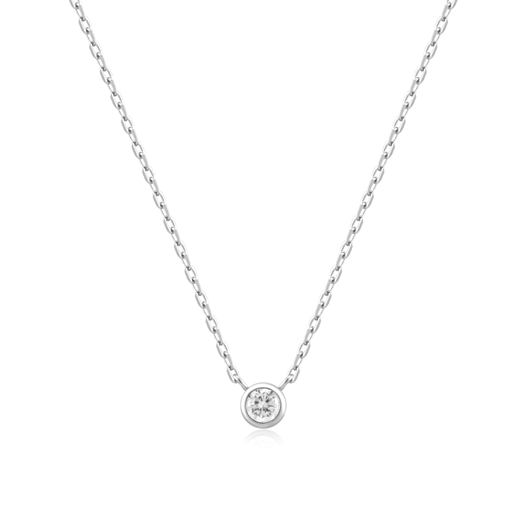 An elevated classic to add to your everyday jewellery rotation, this necklace is rhodium-plated gold sterling silver with a round cut cubic zirconia stone in a bezel setting. Stack it up with other chains or wear it alone, you will definitely refresh your daily styles.